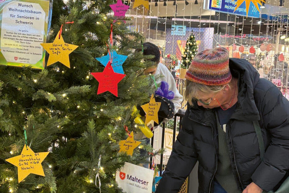 Geschenke kommen von Herzen – und sie erwärmen sie das Herz. Genau das wünschen sich die Malteser für ihre Weihnachtsbaum-Aktion in der Marienplatz-Galerie. Im Erdgeschoss haben sie hier einen Baum geschmückt, an dem neben Lichtern gelbe Papiersterne leuchten. Darauf sind Wünsche Schweriner Senioren vermerkt.